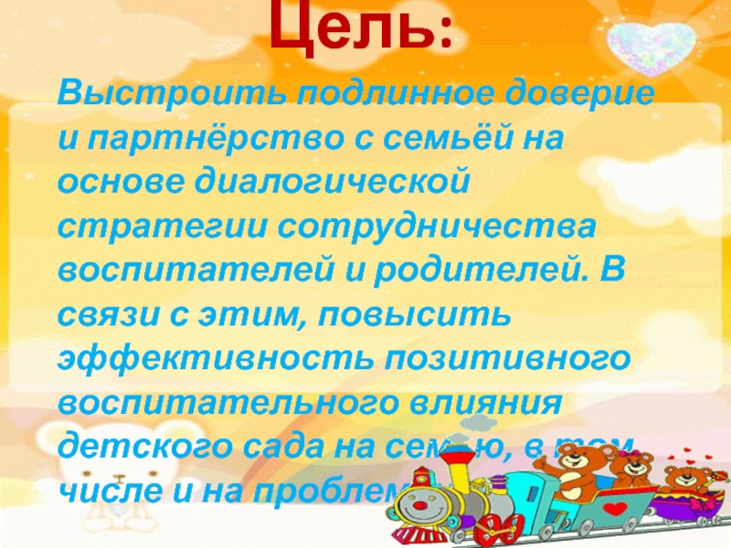 сотрудничества воспитателей и родителей. В связи с этим, повысить эффективность позитивного воспитательного влияния детского сада на семью, в том числе и на проблемную