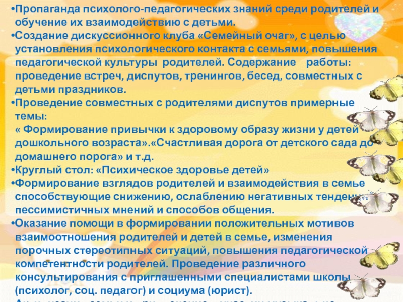 дискуссионного клуба «Семейный очаг», с целью установления психологического контакта с семьями, повышения педагогической культуры родителей. Содержание работы: проведение встреч, диспутов, тренингов, бесед, совместных с детьми праздников.