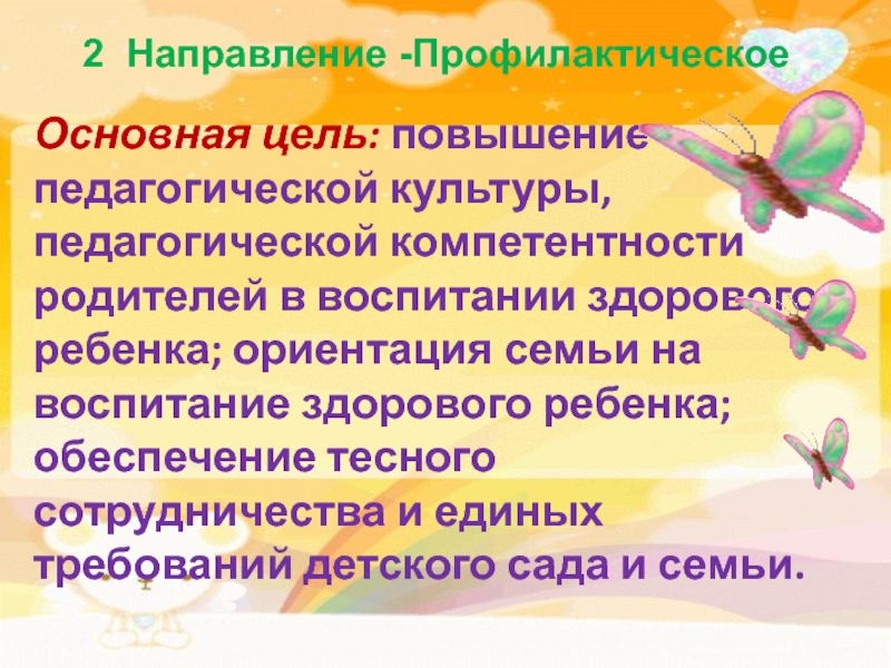 воспитании здорового ребенка; ориентация семьи на воспитание здорового ребенка; обеспечение тесного сотрудничества и единых требований детского сада и семьи.