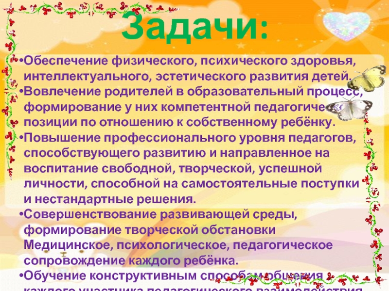 Совершенствование развивающей среды, формирование творческой обстановки Медицинское, психологическое, педагогическое сопровождение каждого ребёнка.
