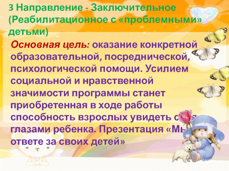 образовательной, посреднической, психологической помощи. Усилием социальной и нравственной значимости программы станет приобретенная в ходе работы способность взрослых увидеть себя глазами ребенка. Презентация «Мы в ответе за своих детей»