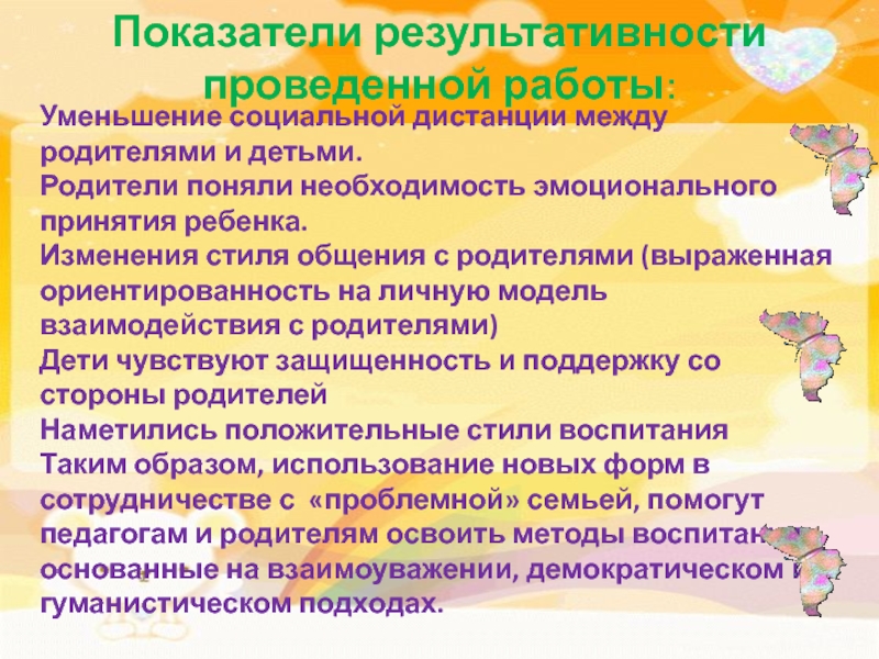 Таким образом, использование новых форм в сотрудничестве с «проблемной» семьей, помогут педагогам и родителям освоить методы воспитания, основанные на взаимоуважении, демократическом и гуманистическом подходах.