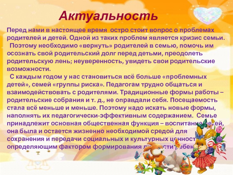 С каждым годом у нас становиться всё больше «проблемных детей», семей «группы риска». Педагогам трудно общаться и взаимодействовать с родителями. Традиционные формы работы – родительские собрания и т. д., не оправдали себя. Посещаемость стала всё меньше и меньше. Поэтому надо искать новые формы, наполнять их педагогически-эффективным содержанием. Семье принадлежит основная общественная функция – воспитание детей, она была и остается жизненно необходимой средой для сохранения и передачи социальных и культурных ценностей, определяющим фактором формирования личности ребенка.