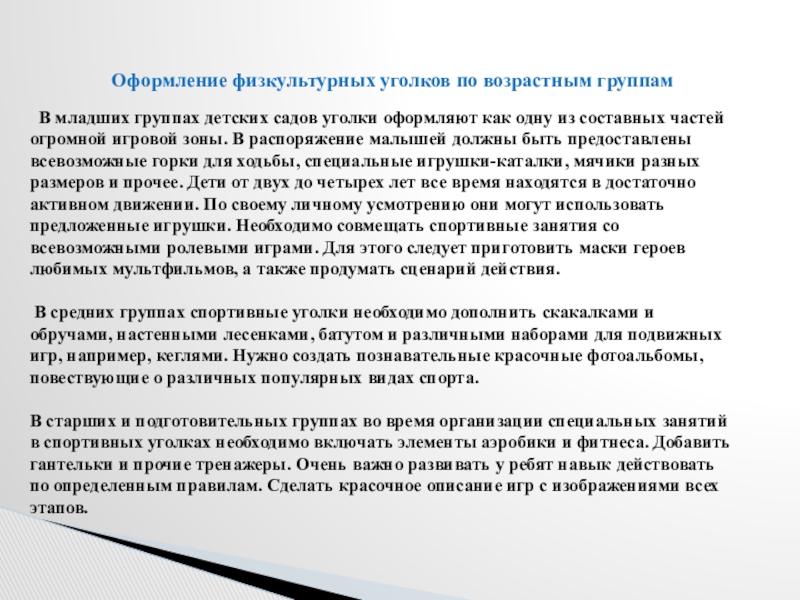 В старших и подготовительных группах во время организации специальных занятий в спортивных уголках необходимо включать элементы аэробики и фитнеса. Добавить гантельки и прочие тренажеры. Очень важно развивать у ребят навык действовать по определенным правилам. Сделать красочное описание игр с изображениями всех этапов.