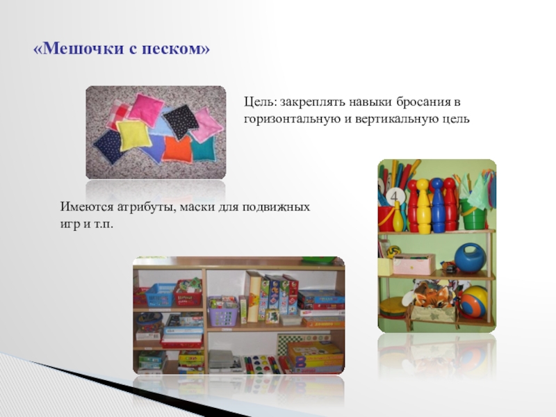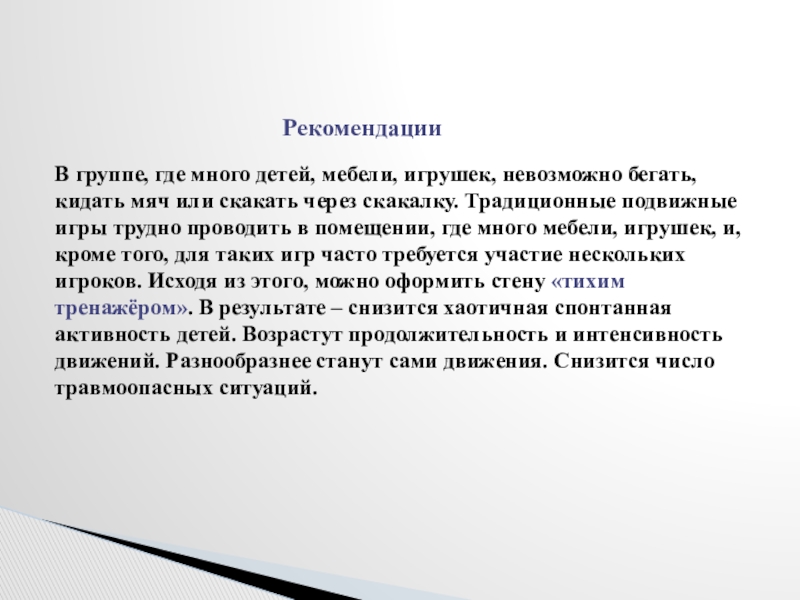 В группе, где много детей, мебели, игрушек, невозможно бегать, кидать мяч или скакать через скакалку. Традиционные подвижные игры трудно проводить в помещении, где много мебели, игрушек, и, кроме того, для таких игр часто требуется участие нескольких игроков. Исходя из этого, можно оформить стену «тихим тренажёром». В результате – снизится хаотичная спонтанная активность детей. Возрастут продолжительность и интенсивность движений. Разнообразнее станут сами движения. Снизится число травмоопасных ситуаций.