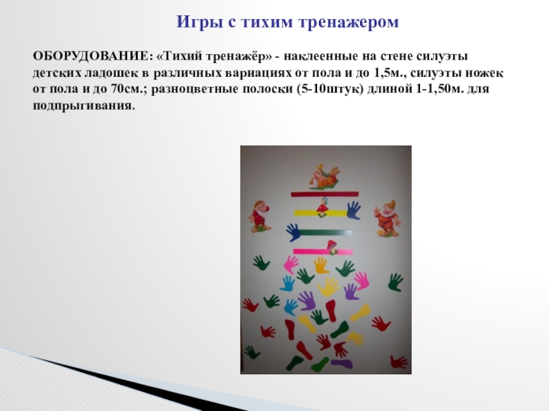 ОБОРУДОВАНИЕ: «Тихий тренажёр» - наклеенные на стене силуэты детских ладошек в различных вариациях от пола и до 1,5м., силуэты ножек от пола и до 70см.; разноцветные полоски (5-10штук) длиной 1-1,50м. для подпрыгивания.