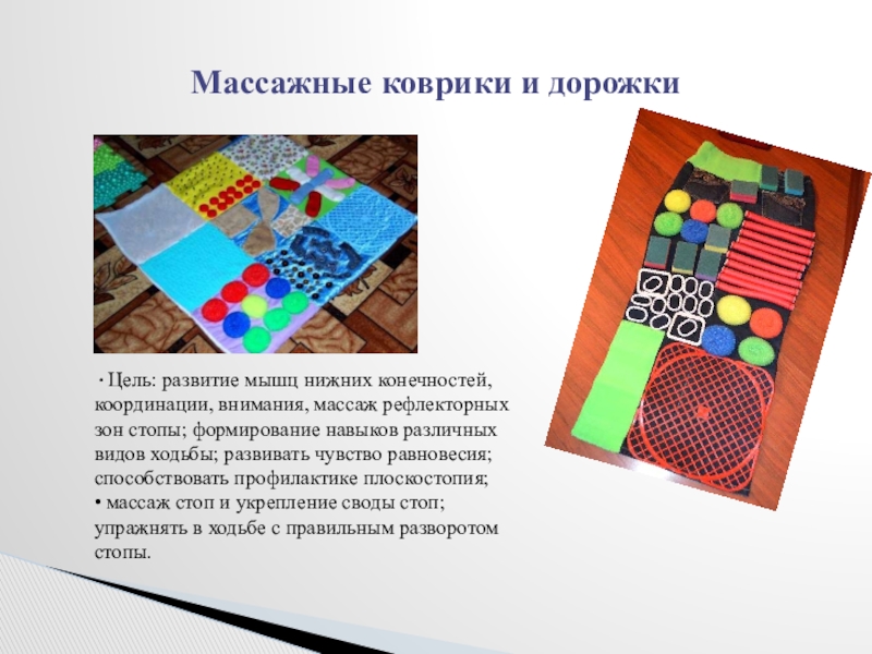 рефлекторных зон стопы; формирование навыков различных видов ходьбы; развивать чувство равновесия; способствовать профилактике плоскостопия;