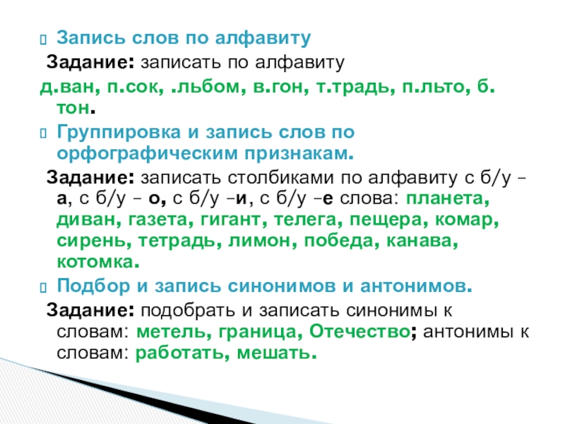 Задание: записать столбиками по алфавиту с б/у –а, с б/у – о, с б/у –и, с б/у –е слова: планета, диван, газета, гигант, телега, пещера, комар, сирень, тетрадь, лимон, победа, канава, котомка.