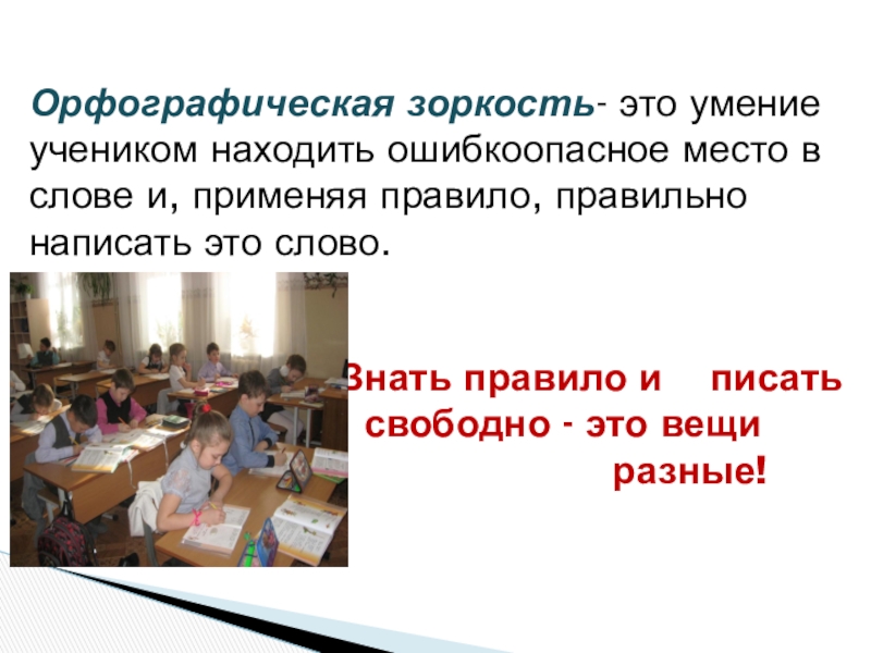 Слайд 3Орфографическая зоркость- это умение учеником находить ошибкоопасное место в слове и,