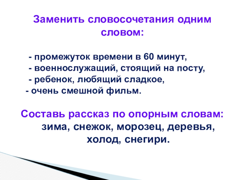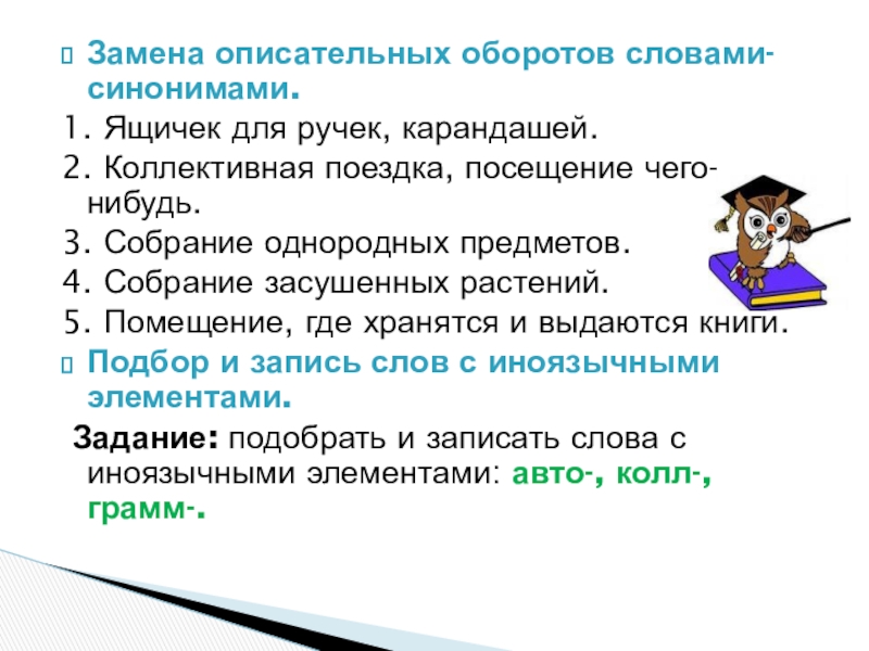 Слайд 21Замена описательных оборотов словами-синонимами.