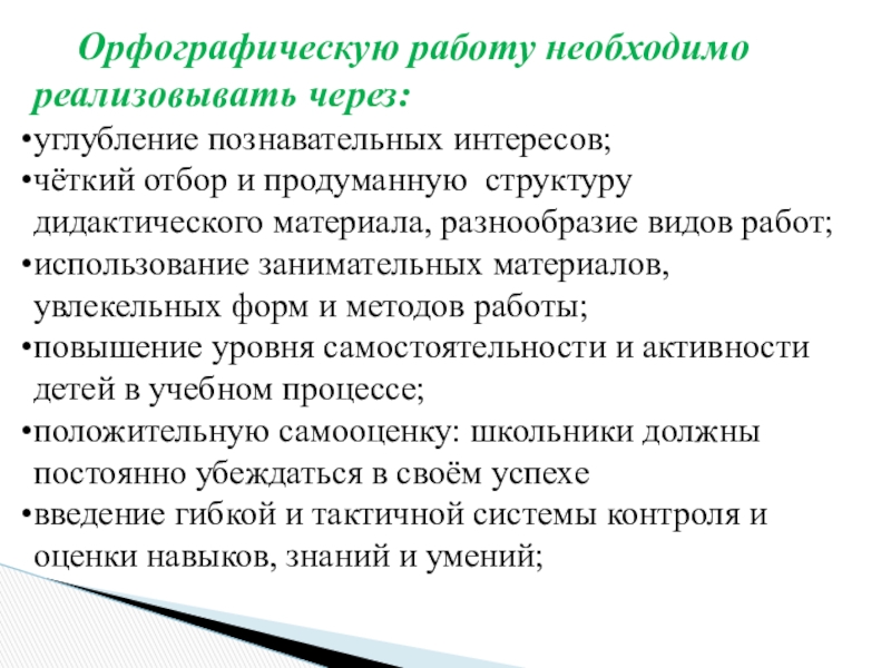 Слайд 4Орфографическую работу необходимо реализовывать через: