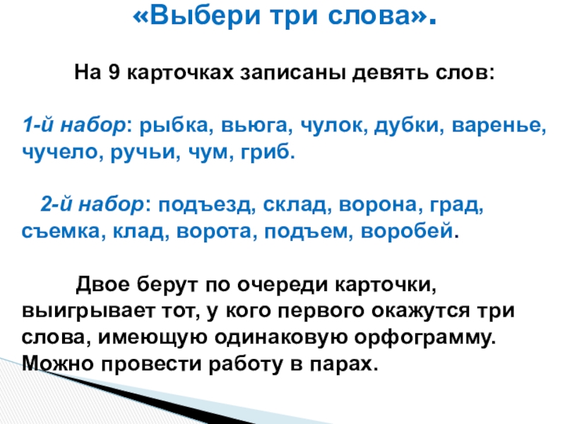 Двое берут по очереди карточки, выигрывает тот, у кого первого окажутся три слова, имеющую одинаковую орфограмму. Можно провести работу в парах.