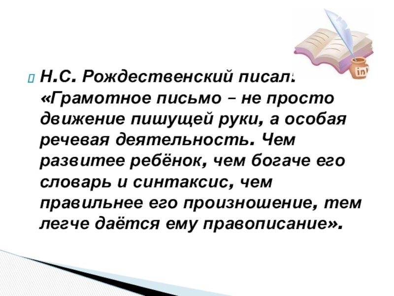 Слайд 2Н.С. Рождественский писал: «Грамотное письмо – не просто движение пишущей руки,