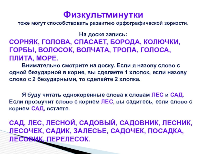 Внимательно смотрите на доску. Если я назову слово с одной безударной в корне, вы сделаете 1 хлопок, если назову слово с 2 безударными, то сделайте 2 хлопка.