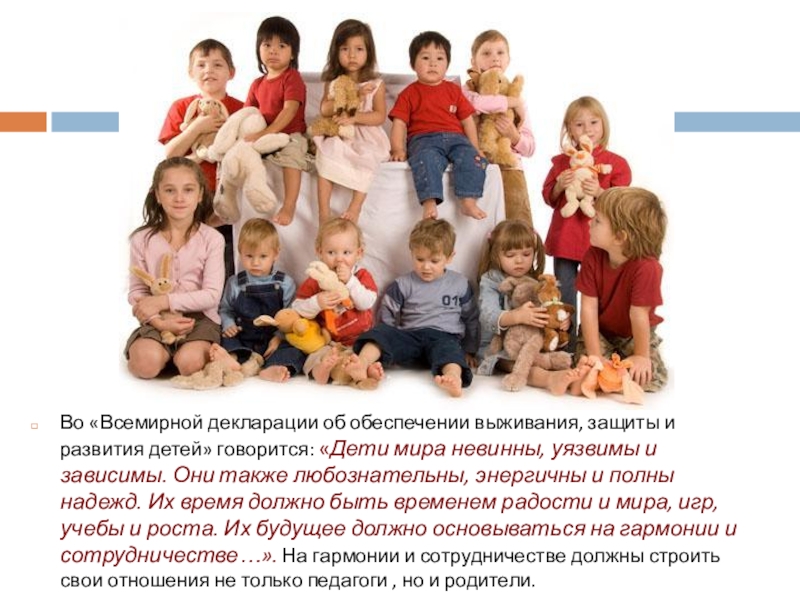 «Дети мира невинны, уязвимы и зависимы. Они также любознательны, энергичны и полны надежд. Их время должно быть временем радости и мира, игр, учебы и роста. Их будущее должно основываться на гармонии и сотрудничестве…». На гармонии и сотрудничестве должны строить свои отношения не только педагоги , но и родители.