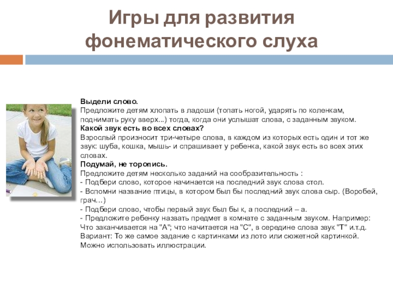 Взрослый произносит три-четыре слова, в каждом из которых есть один и тот же звук: шуба, кошка, мышь- и спрашивает у ребенка, какой звук есть во всех этих словах.