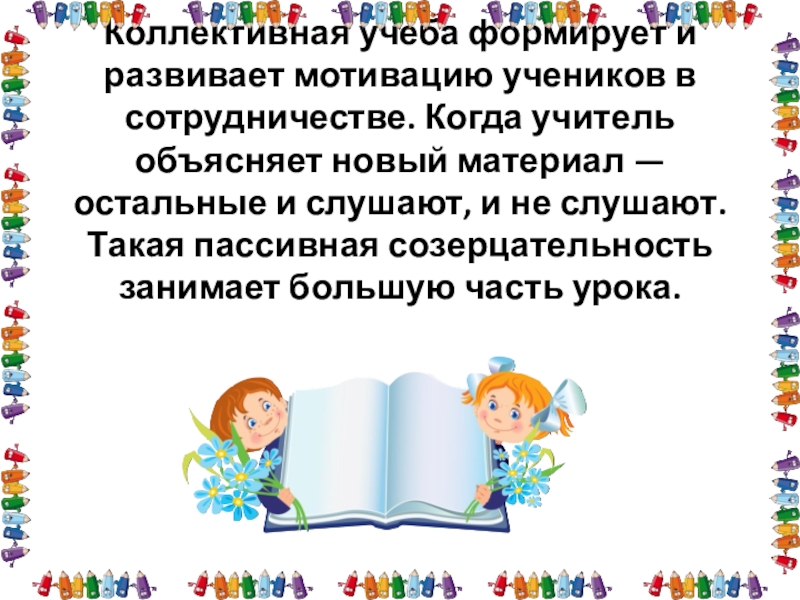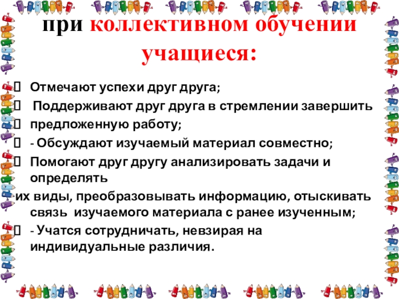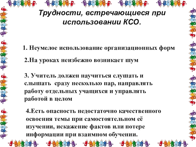 4.Есть опасность недостаточно качественного освоения темы при самостоятельном её изучении, искажение фактов или потере информации при взаимном обучении.
