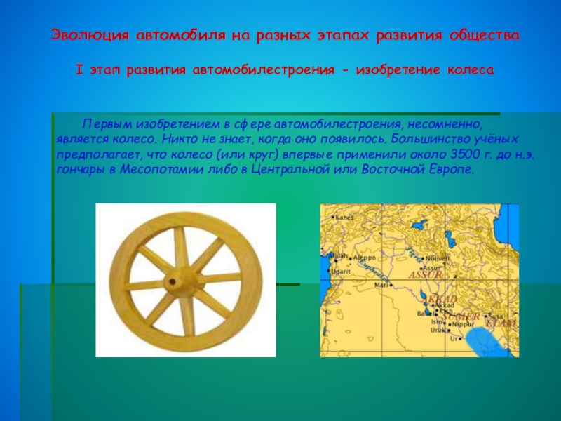 Первым изобретением в сфере автомобилестроения, несомненно, является колесо. Никто не знает, когда оно появилось. Большинство учёных предполагает, что колесо (или круг) впервые применили около 3500 г. до н.э. гончары в Месопотамии либо в Центральной или Восточной Европе.