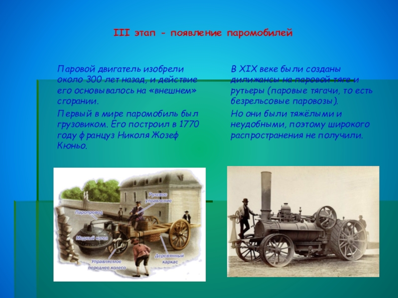 В XIX веке были созданы дилижансы на паровой тяге и рутьеры (паровые тягачи, то есть безрельсовые паровозы).