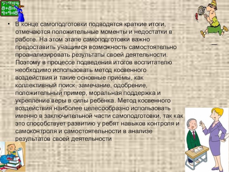 в работе. На этом этапе самоподготовки важно предоставить учащимся возможность самостоятельно проанализировать результаты своей деятельности. Поэтому в процессе подведения итогов воспитателю необходимо использовать метод косвенного воздействия и такие основные приёмы, как коллективный поиск, замечание, одобрение, положительный пример, моральная поддержка и укрепление веры в силы ребёнка. Метод косвенного воздействия наиболее целесообразно использовать именно в заключительной части самоподготовки, так как это способствует развитию у ребят навыков контроля и самоконтроля и самостоятельности в анализе результатов своей деятельности