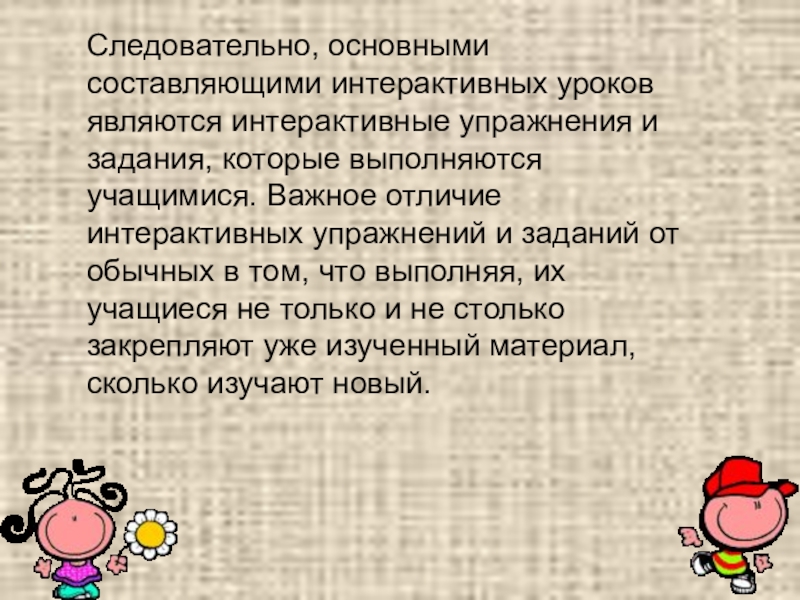 выполняются учащимися. Важное отличие интерактивных упражнений и заданий от обычных в том, что выполняя, их учащиеся не только и не столько закрепляют уже изученный материал, сколько изучают новый.