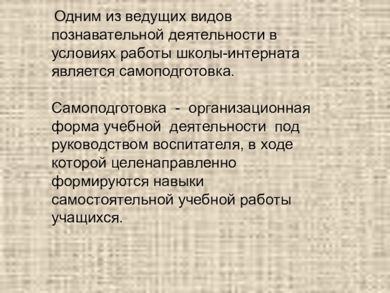 Самоподготовка - организационная форма учебной деятельности под руководством воспитателя, в ходе которой целенаправленно формируются навыки самостоятельной учебной работы учащихся.
