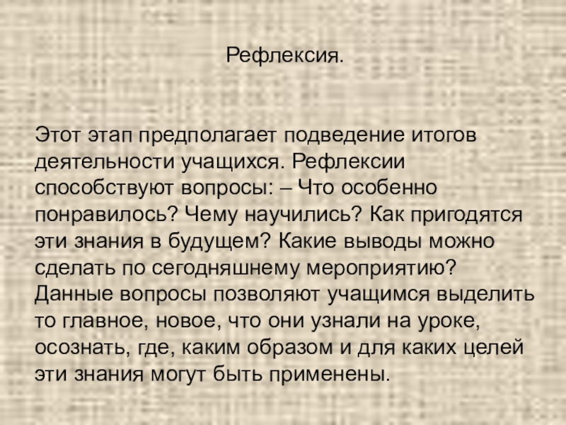 Этот этап предполагает подведение итогов деятельности учащихся. Рефлексии способствуют вопросы: