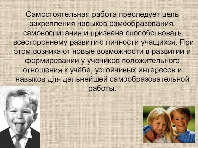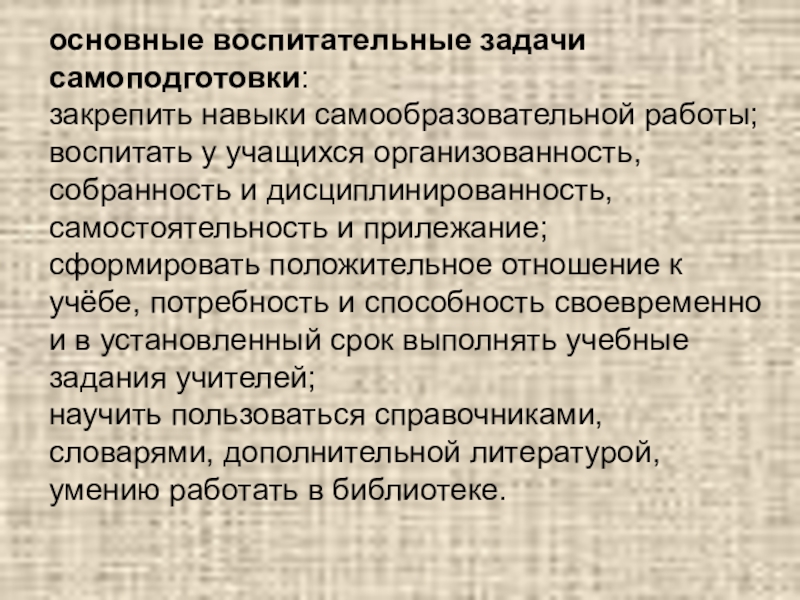 Слайд 27Самостоятельная работа преследует цель закрепления навыков самообразования, самовоспитания и призвана способствовать