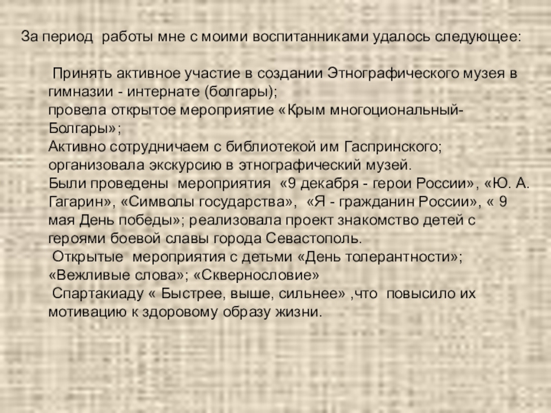 участие в создании Этнографического музея в гимназии - интернате (болгары);
