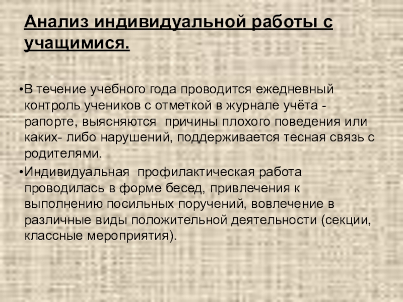Индивидуальная профилактическая работа проводилась в форме бесед, привлечения к выполнению посильных поручений, вовлечение в различные виды положительной деятельности (секции, классные мероприятия).