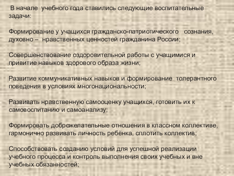 Слайд 6 В начале учебного года ставились следующие воспитательные задачи: