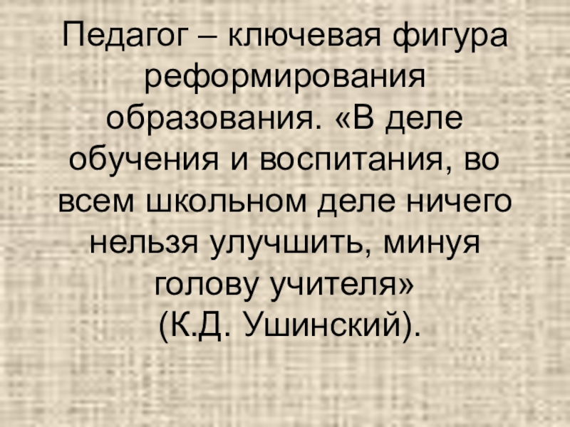 Слайд 2Педагог – ключевая фигура реформирования образования. «В деле обучения и воспитания,