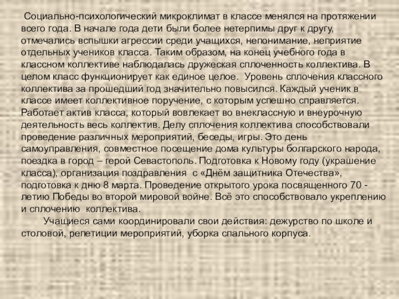 начале года дети были более нетерпимы друг к другу, отмечались вспышки агрессии среди учащихся, непонимание, неприятие отдельных учеников класса. Таким образом, на конец учебного года в классном коллективе наблюдалась дружеская сплоченность коллектива. В целом класс функционирует как единое целое. Уровень сплочения классного коллектива за прошедший год значительно повысился. Каждый ученик в классе имеет коллективное поручение, с которым успешно справляется. Работает актив класса, который вовлекает во внеклассную и внеурочную деятельность весь коллектив. Делу сплочения коллектива способствовали проведение различных мероприятий, беседы, игры. Это день самоуправления, совместное посещение дома культуры болгарского народа, поездка в город – герой Севастополь. Подготовка к Новому году (украшение класса), организация поздравления с «Днём защитника Отечества», подготовка к дню 8 марта. Проведение открытого урока посвященного 70 - летию Победы во второй мировой войне. Всё это способствовало укреплению и сплочению коллектива.