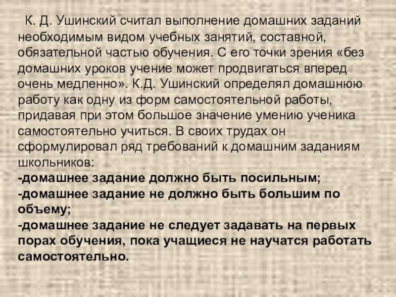 составной, обязательной частью обучения. С его точки зрения «без домашних уроков учение может продвигаться вперед очень медленно». К.Д. Ушинский определял домашнюю работу как одну из форм самостоятельной работы, придавая при этом большое значение умению ученика самостоятельно учиться. В своих трудах он сформулировал ряд требований к домашним заданиям школьников: