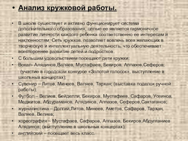 хореография – Мустафаев, Сафаров, Аппазов, Бекиров,Абдулганиев Алядинов; (выступление в школьных концертах);