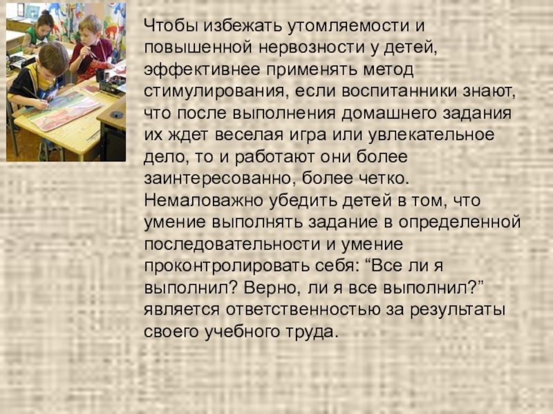 метод стимулирования, если воспитанники знают, что после выполнения домашнего задания их ждет веселая игра или увлекательное дело, то и работают они более заинтересованно, более четко. Немаловажно убедить детей в том, что умение выполнять задание в определенной последовательности и умение проконтролировать себя: “Все ли я выполнил? Верно, ли я все выполнил?” является ответственностью за результаты своего учебного труда.
