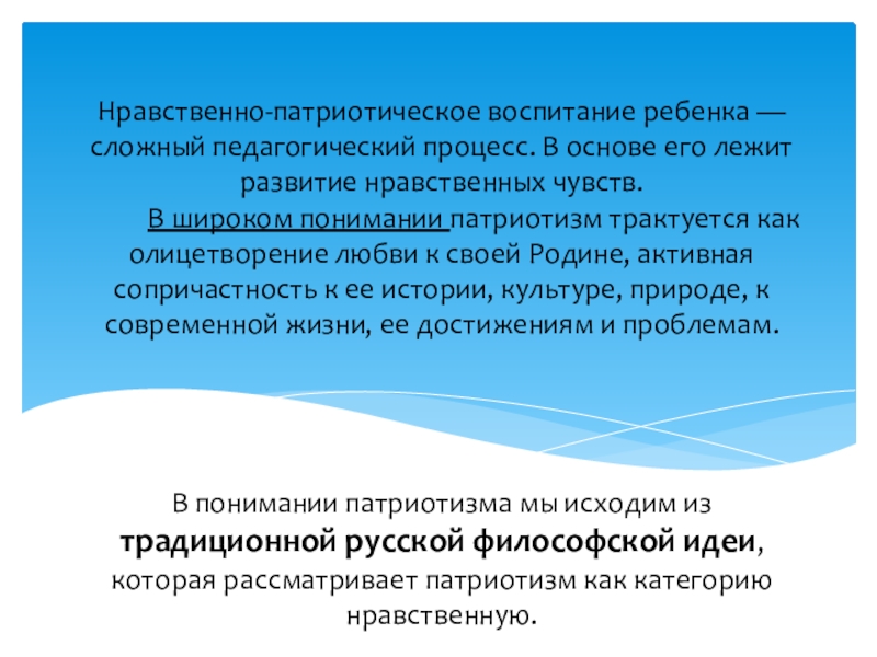 В понимании патриотизма мы исходим из традиционной русской философской идеи, которая рассматривает патриотизм как категорию нравственную.