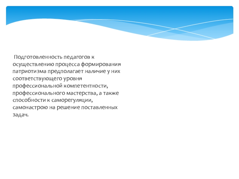 Слайд 10 Подготовленность педагогов к осуществлению процесса формирования патриотизма предполагает наличие у