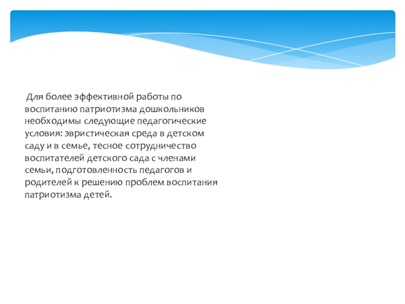 Слайд 7 Для более эффективной работы по воспитанию патриотизма дошкольников необходимы следующие педагогические