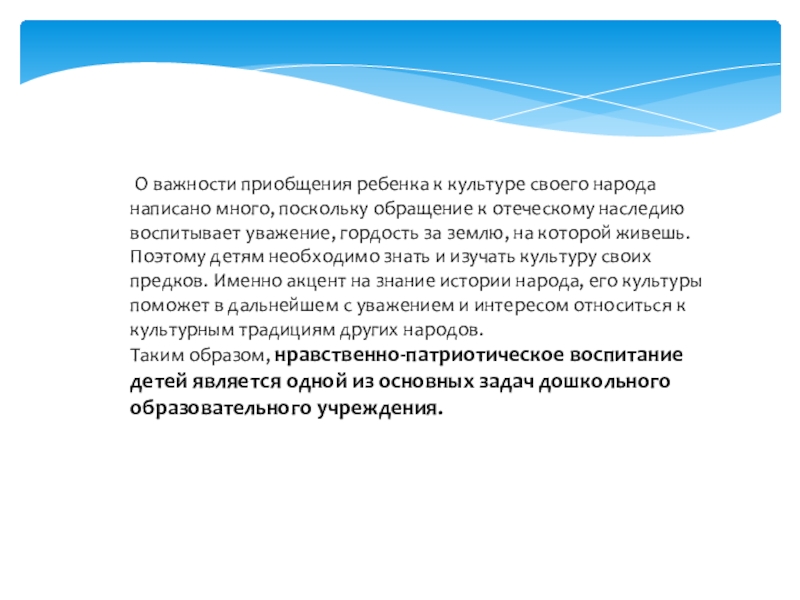 поскольку обращение к отеческому наследию воспитывает уважение, гордость за землю, на которой живешь. Поэтому детям необходимо знать и изучать культуру своих предков. Именно акцент на знание истории народа, его культуры поможет в дальнейшем с уважением и интересом относиться к культурным традициям других народов.