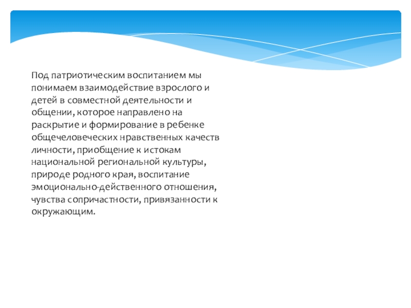 Слайд 5Под патриотическим воспитанием мы понимаем взаимодействие взрослого и детей в совместной