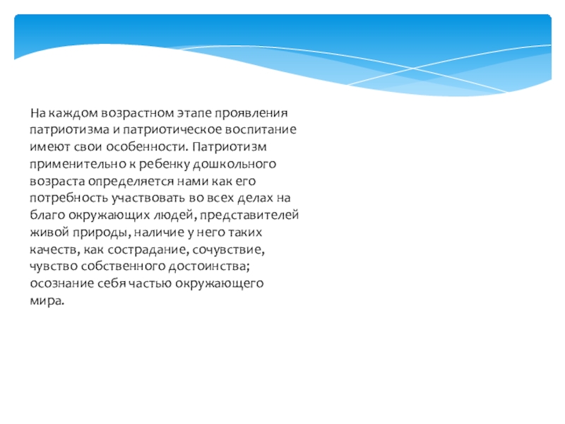 Слайд 6На каждом возрастном этапе проявления патриотизма и патриотическое воспитание имеют свои
