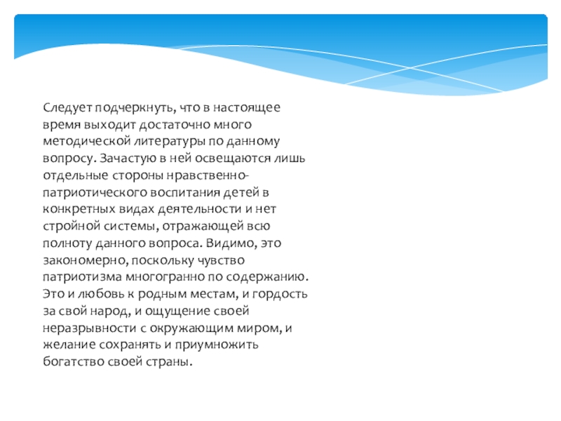 по данному вопросу. Зачастую в ней освещаются лишь отдельные стороны нравственно-патриотического воспитания детей в конкретных видах деятельности и нет стройной системы, отражающей всю полноту данного вопроса. Видимо, это закономерно, поскольку чувство патриотизма многогранно по содержанию. Это и любовь к родным местам, и гордость за свой народ, и ощущение своей неразрывности с окружающим миром, и желание сохранять и приумножить богатство своей страны.