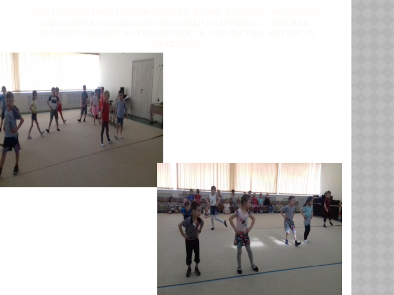 Слайд 40При разучивании танцев (полька, вальс, кадриль) мальчики овладевают навыками ведущего партнера,