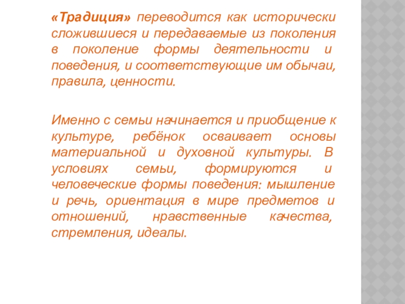 Слайд 4«Традиция» переводится как исторически сложившиеся и передаваемые из поколения в поколение