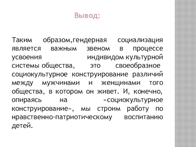 это своеобразное социокультурное конструирование различий между мужчинами и женщинами того общества, в котором он живет. И, конечно, опираясь на «социокультурное конструирование», мы строим работу по нравственно-патриотическому воспитанию детей.