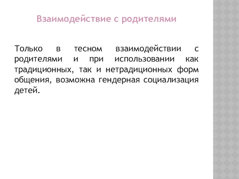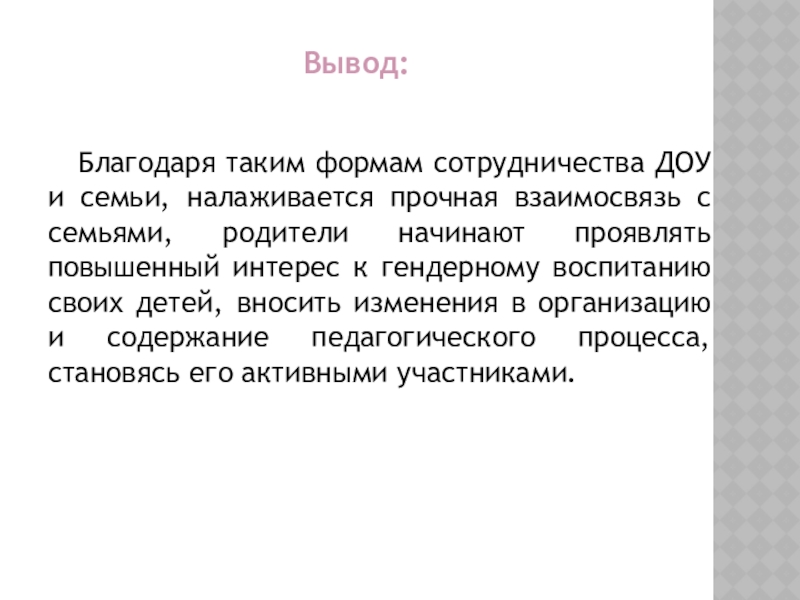 взаимосвязь с семьями, родители начинают проявлять повышенный интерес к гендерному воспитанию своих детей, вносить изменения в организацию и содержание педагогического процесса, становясь его активными участниками.