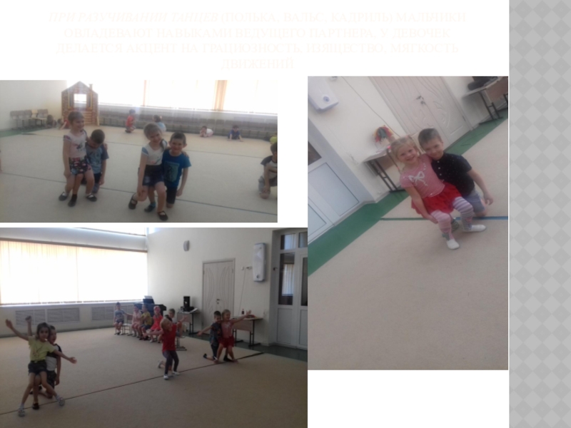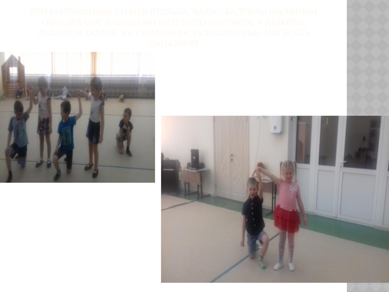 Слайд 39При разучивании танцев (полька, вальс, кадриль) мальчики овладевают навыками ведущего партнера,