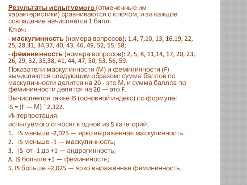 Показатели маскулинности (М) и фемининности (F) вычисляются следующим образом: сумма баллов по маскулинности делится на 20 - это М, и сумма баллов по фемининности делится на 20 — это F.