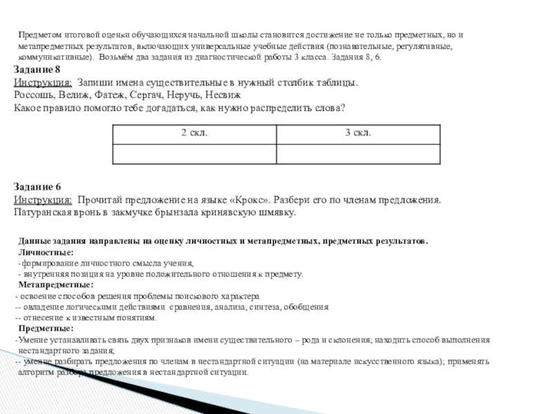 Предметом итоговой оценки обучающихся начальной школы становится достижение не только предметных, но и метапредметных результатов, включающих универсальные учебные действия (познавательные, регулятивные, коммуникативные). Возьмём два задания из диагностической работы 3 класса. Задания 8, 6.